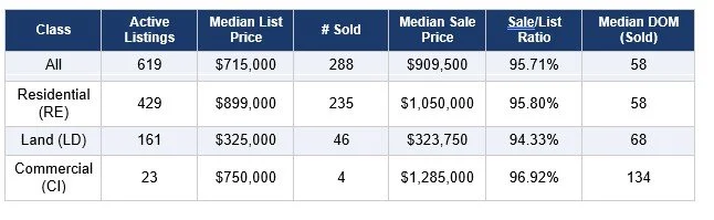 The sale-to-list ratio of 95.80% tells an important story: sellers are getting close to asking price, but buyers are not rolling over. Meaningful negotiation is back — and that’s healthy. Homes priced and presented correctly are closing efficiently, with a median of 58 days on market for sold properties. The 75 unsold residential listings averaged $2,056,825 in list price, suggesting that overpriced inventory in the upper tier is sitting rather than closing.